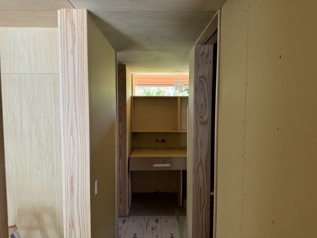 現在工事中の新築現場。大工工事も終盤に差し掛かり、徐々に造作家具たちの形が見えてきました。 トップの写真は今回もご採用いただいた、造作手洗い場。玄関から入って、すぐの動線上にあります。ただの廊下とせずに、機能を持たせ、上