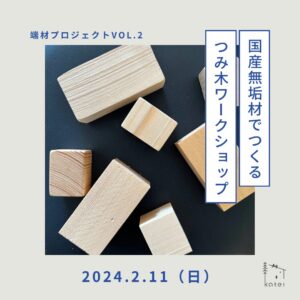 今回は、国産のヒノキや杉を使った「つみ木づくりのワークショップ」のお知らせです。 家をつくるためによく使う無垢材は、現場で長さを合わせてカットして使います。すると、どうしても使いきれない長さのものが出てしまいます。国産ヒ