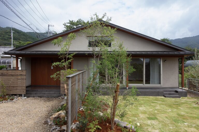 山々を背景に、南の光を取り込む三角屋根の平屋 南北にひらけた敷地の特性を活かし、自然と適度につながる暮らしをかたちにした住まいです。北側には山々や樹木の景色を借景として楽しみ、南側には大きく窓を開けたパッシブ設計を採用。