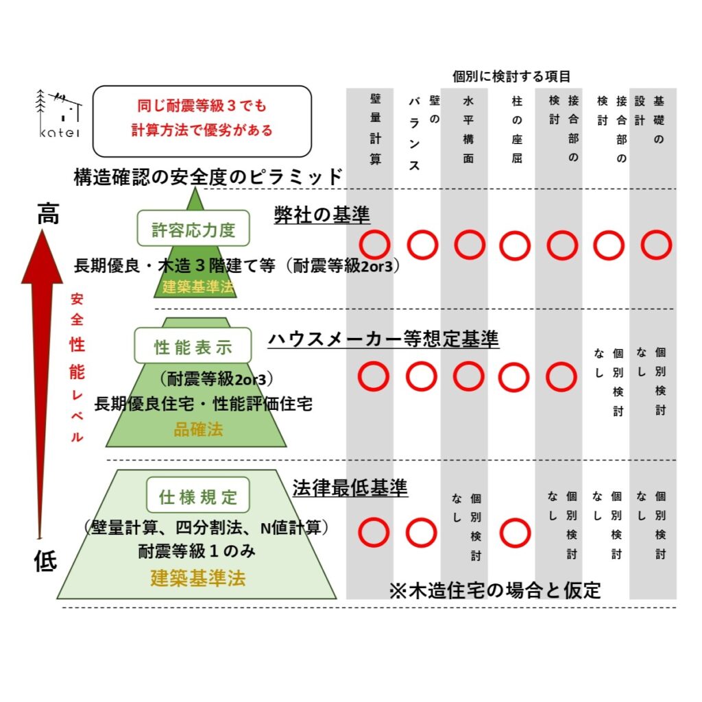 建築基準の中でも最高レベルとされる耐震等級3を標準とし、すべての建物で許容応力度計算を実施しています。