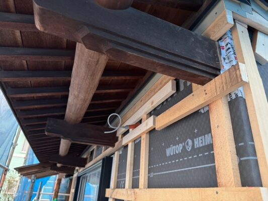 屋外は、以前は防水紙のない状態でトタンが張られていましたが、今回は取り合い部分を中心に、しっかりと防水補強を施します。