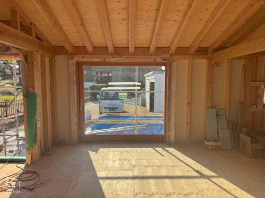 風和の住まい新築工事にてノルドの木製サッシ、外部用の片引戸を取り付けました。